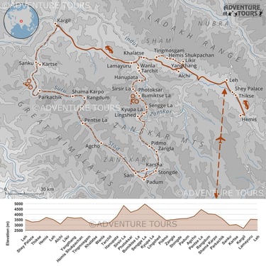 En pédalant à travers cette région enchanteresse, vous franchirez des cols élevés comme le Sengge La à 4980 mètres et le Pensi La à 4460 mètres, qui offre des vues spectaculaires sur le glacier Drang Drung. En chemin, vous vous immergerez dans la riche culture du Ladakh, en visitant d'anciens monastères et de charmants villages qui témoignent des traditions uniques de la région.