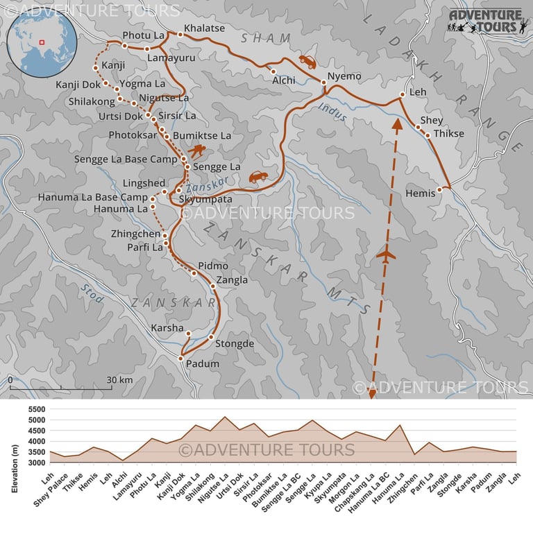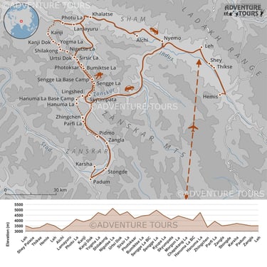 Embark on an unforgettable journey through the breathtaking landscapes of Zanskar, trekking from Kanji to Zangla, where adventure meets serenity in the heart of the Indian Himalayas. This epic 9 days trek begins in the picturesque village of Kanji, leading you along sparkling river valleys and over high passes like the Nigutse La pass at 5140 metres, and the Sengge La pass at 4980 metres, offering stunning views of the rugged terrain and ancient monasteries.